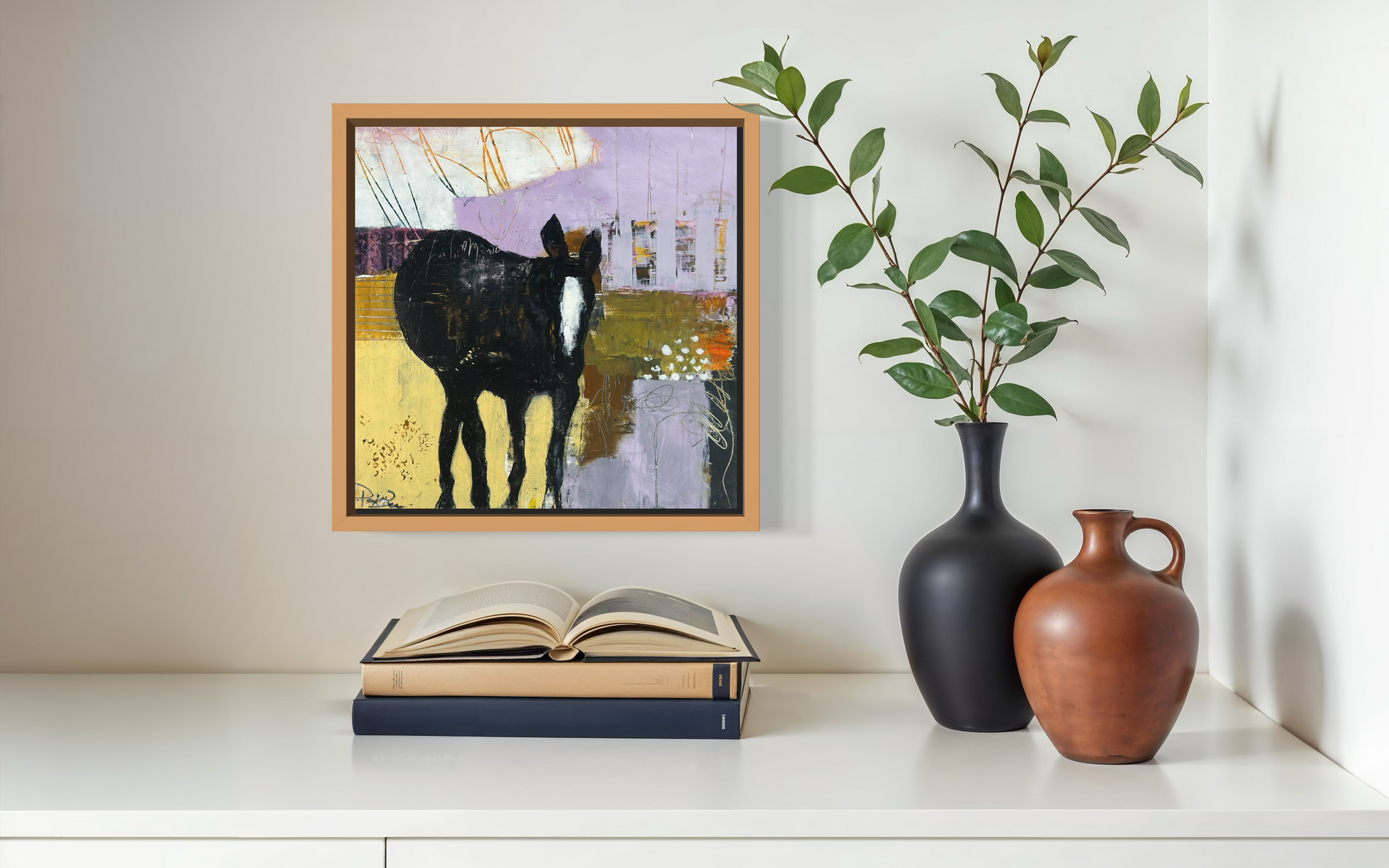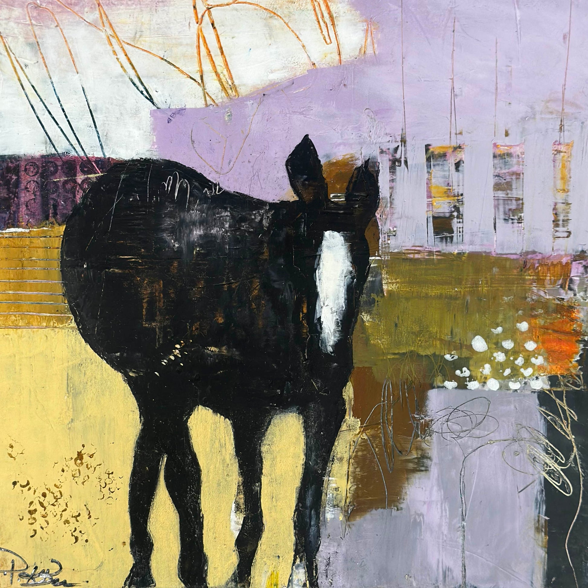 Original Oil and Cold Wax on wood panel framed. Black horse on neutral and lavender abstract.